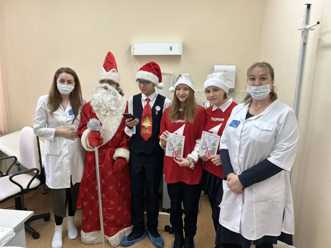 Волонтёры пришли поздравить сотрудников медицинского учреждения с наступающими праздниками и вручили врачам поздравительные открытки.